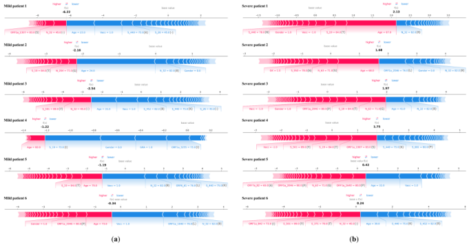 图3 基于COVID-19患者样本的SHAP力图(a)轻症患者和(b)重症患者