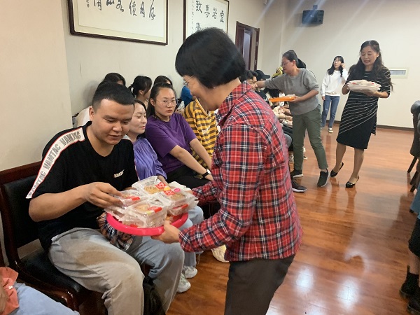 党总支书记石明娟给同学们发放节日慰问品