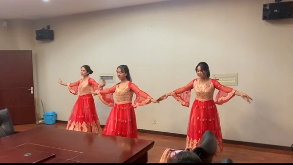 座谈会上,在座的领导、老师还向参会同学发放了水果、月饼等节日慰问品,表达学院对全体同学的关心关怀。2020级维吾尔族新生穆耶赛尔·麦麦提敏、努尔比耶·图尔荪托合提、沙克拉·伊斯拉木江表演了维吾尔族舞蹈《唢呐曲》,欢快的音乐和曼妙的舞蹈获得了在场师生的热烈掌声。
