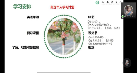 首先分享的是17级井雨濛同学,她提到封校期间首先要找到自己的学习特点,根据自己的特点找到适合自己的学习方法,其次要明确自己能力范围内的学习目标并制定一份学习计划表,最后一点要保持愉悦的心情放到学习当中,快乐的学习。
