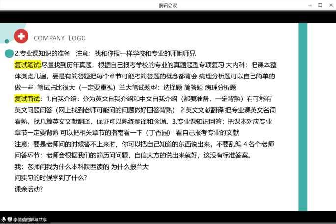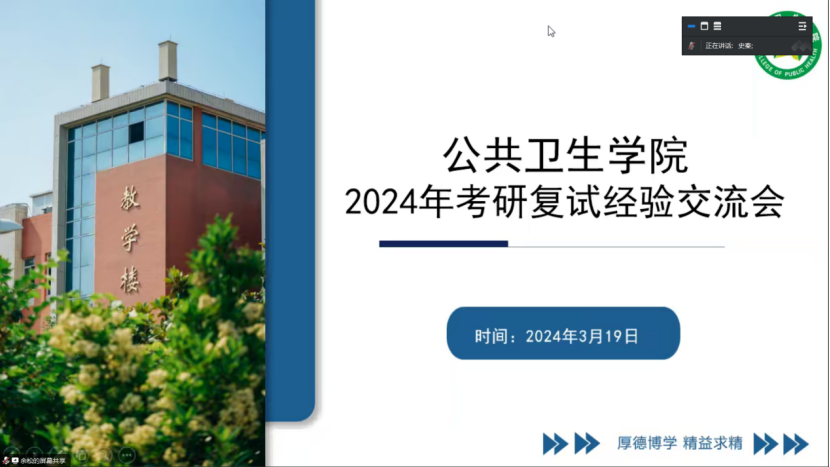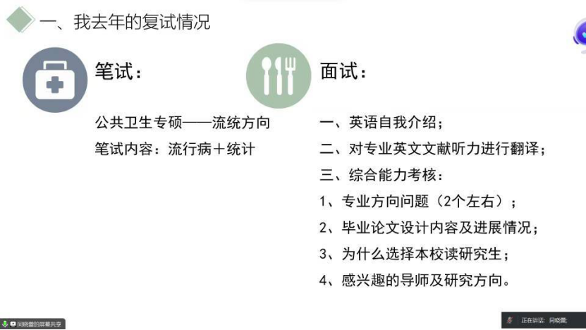 在石河子大学公共卫生专业就读的同晓蕾先与同学们分享了自己去年的考研情况,建议同学们可以提前联系导师进行有效的沟通,积极地向往届的校友进行咨询。除此之外,她提出专业课的复习是重中之重,对于医学生而言更是检验学习效果的一个体现,复试中要充分发挥自身优势,自信大方,多方面展现个人实力。