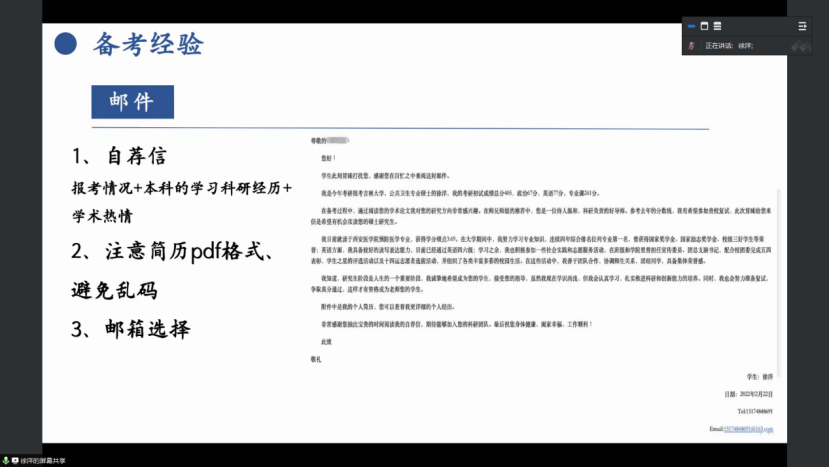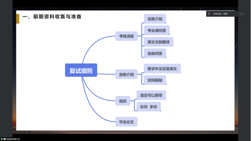兰州大学内科学专业的研究生李倩倩向同学们分享了简历书写的注意事项,强调了实习经历、个人荣誉、自我评价部分。在分享中她指出复试前要充分了解本专业学界的研究概况,包括前辈学者的著作成果、相关领域的主要论题、学术前沿尚待深入的方面等。此外,她还提到复试作答时态度一定要诚恳,同时也要注意突出自己的优势,给老师留下良好的印象。