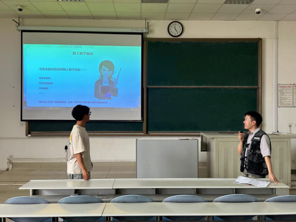 劳动讲堂最后,杜洲同学邀请了几位同学上台互动,模拟兼职面试时自我介绍的场景。这几位同学分别分享了自己的相关经历和技能。杜洲同学对他们的表现进行了点评和指导,让同学们更加清楚地了解到在面试中应该如何展现自己的优势。