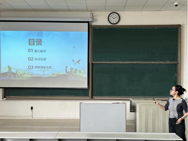 随后,我院学生科助理辅导员杜洲同学结合自身丰富的经历,为大家深入剖析了勤工助学的意义与价值。他以自己曾经在不同岗位上的勤工助学经历为例,生动地向同学们展示了劳动的多样性和重要性。他分享了在工作中遇到的困难与挑战,以及如何通过努力和坚持克服这些困难之后最终取得收获。这些真实的故事让同学们感同身受,更加深刻地理解了劳动的艰辛与乐趣。