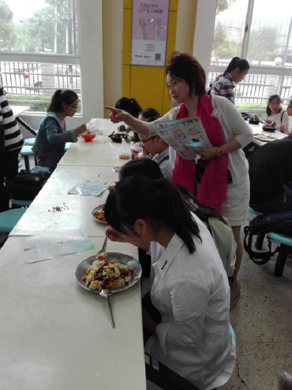 活动伊始,志愿者们在曹老师的带领下在食堂门口布置活动现场、摆放活动宣传展板。